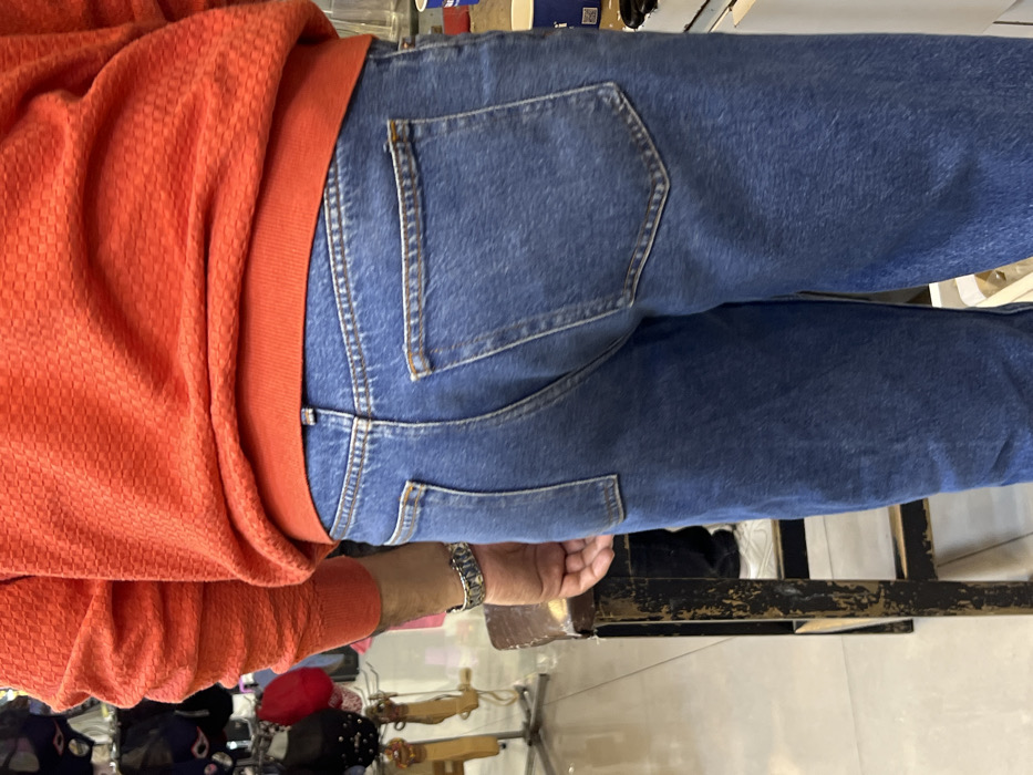The image presents a posterior view of an individual standing within an indoor commercial environment, specified as Barza Municipality, Syria, though no visual markers in the image confirm this location. The person is wearing a long-sleeved, textured orange top and blue denim jeans. A silver-toned wristwatch is visible on the individual's left wrist, which rests on a dark, heavily worn wooden stool with chipped paint. In the background to the left, a metal display rack is visible, holding multiple items, likely hats or caps, in various colors including black and red. The flooring appears to be a light-colored tile or polished surface. Blurred elements in the right background suggest additional retail fixtures or equipment. No explicit actions or interactions beyond the person standing are discernible.