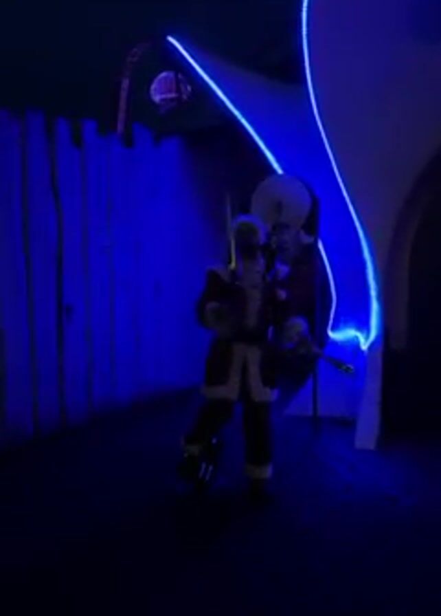 A person dressed as Santa Claus stands in a darkened room with blue neon lights. The person is holding two umbrella-like objects. Behind the person is a wooden fence and a white archway. A poster with a cartoon reindeer is visible. The person throws something into the air and catches it.