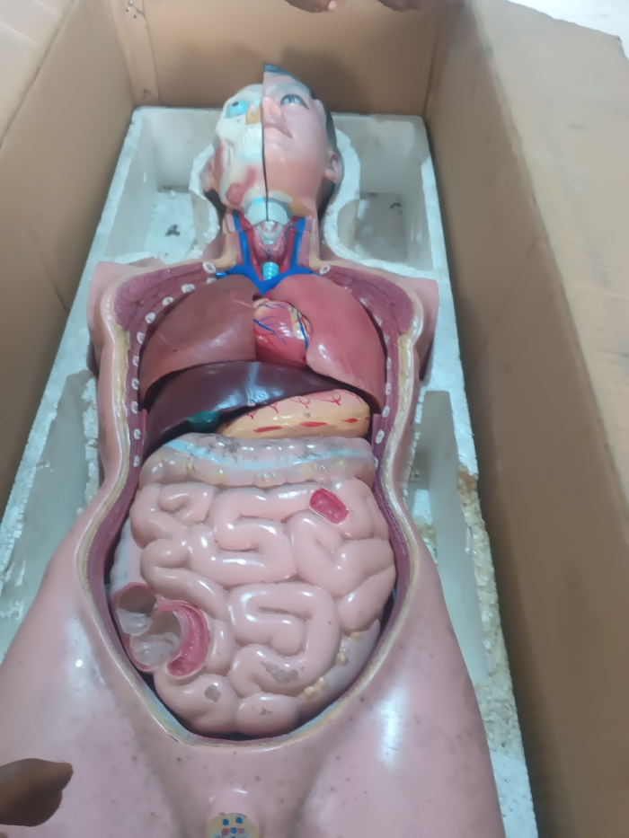 - "A human anatomical torso model, displaying internal organs, is positioned within a cardboard box lined with white styrofoam packaging material" by FM-KuKCT2, licensed under CC BY 4.0
