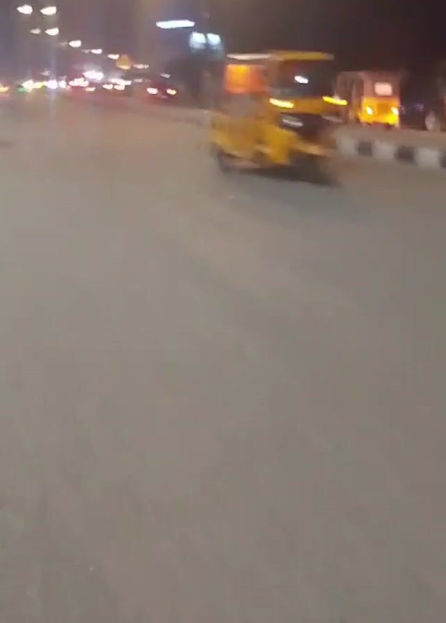 A man walks down a street at night. The street has a paved surface. There are streetlights illuminating the road, and some vehicles are visible in the distance. The man is wearing a dark short-sleeved shirt and dark pants. The camera follows him from behind as he walks away.