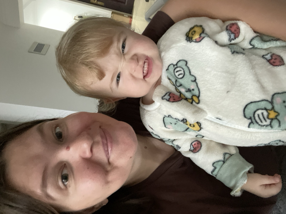 A woman and child are in a selfie. The woman is positioned at the bottom left, with the child next to her on the right. The woman has dark hair and a mole on her face. The child has blonde hair and is wearing a white onesie with a dinosaur and strawberry pattern. The child is making a silly face with their nose scrunched up and showing their teeth. The background is blurred, but it appears to be indoors.