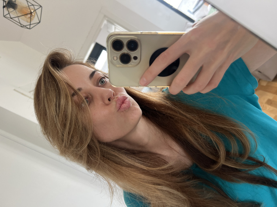 A mirror selfie captures a female individual with long, layered, light brown hair and green eyes, wearing a teal t-shirt