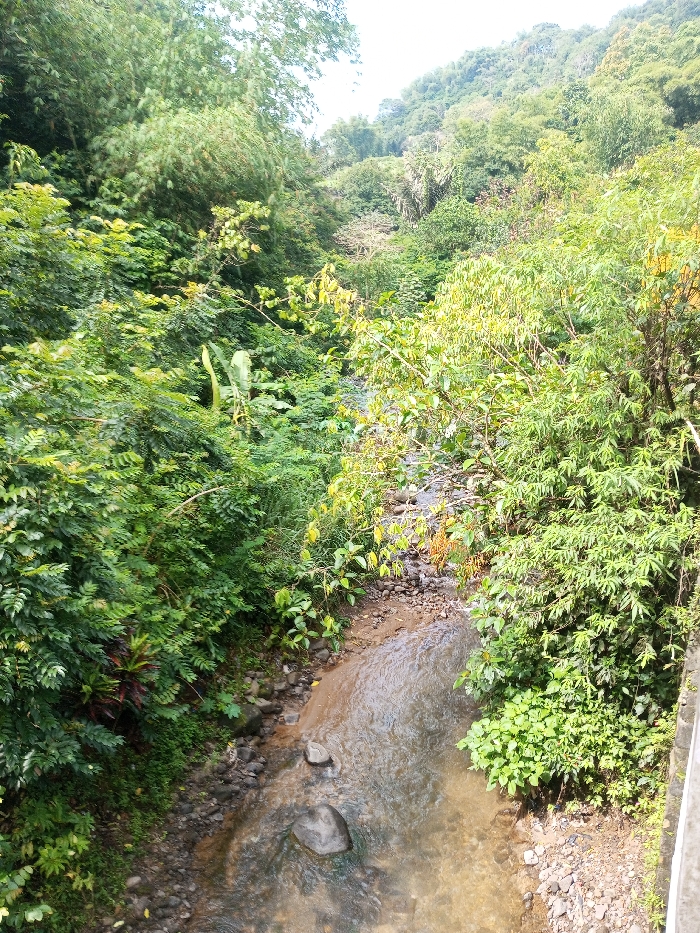 A small stream flows through a lush green valley. Trees and various plants densely cover the valley sides. The stream is shallow, with rocks and pebbles visible along its bed. The overall scene captures a vibrant natural environment, possibly from a high vantage point like a bridge overlooking the river.