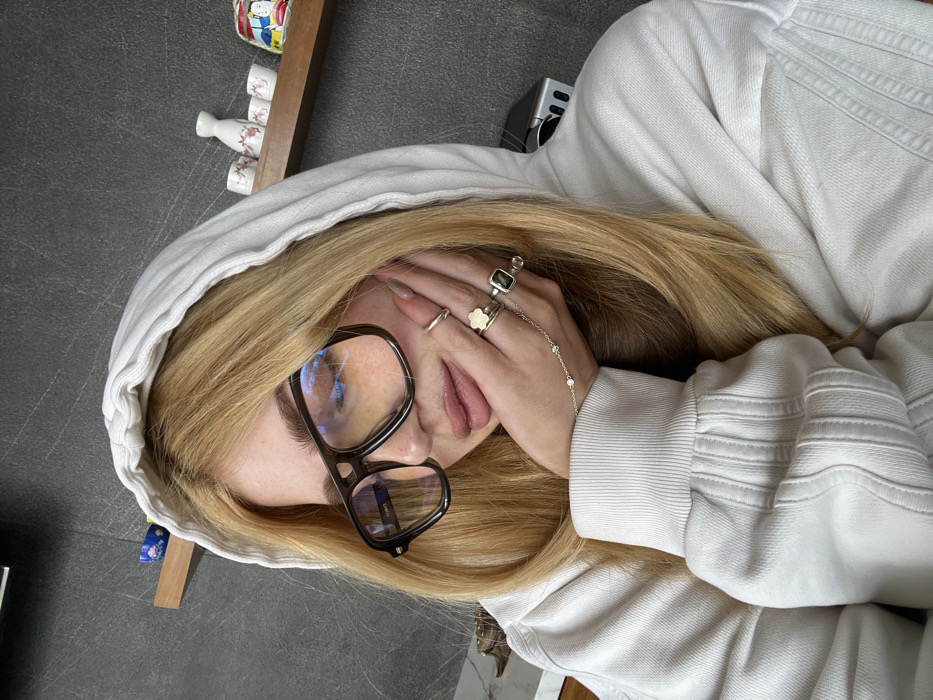 A woman with blonde hair wearing a white hooded sweatshirt and large black-framed glasses reclines with her hand partially covering her face. She is wearing multiple rings on her fingers and a delicate bracelet on her wrist. A small wooden shelf with ceramic items sits near her head. The background features a gray surface and glimpses of other household objects.
