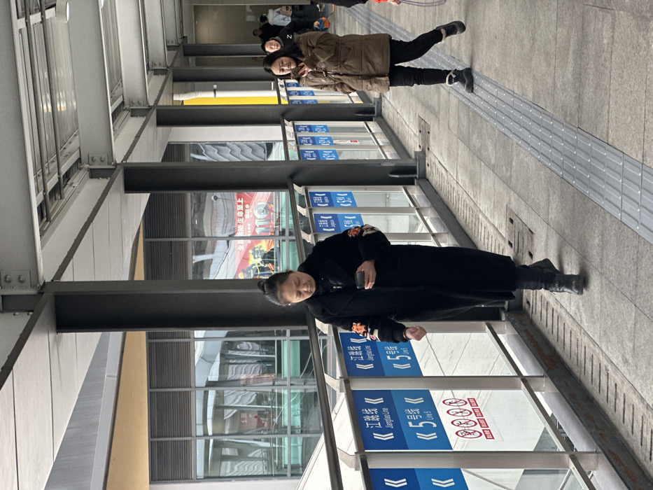 Two women stand on a walkway, one in a brown jacket and black pants, the other in a long black coat. The walkway has metal supports and glass partitions with blue signage. Through the glass, advertisements are visible. The ground is gray with tactile paving. The woman in the black coat appears to be holding something in her hand.