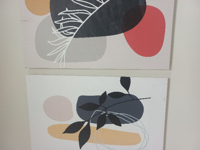 Two square art canvases adorn a white wall. The top artwork displays abstract shapes in muted tones: tan, gray, red, and a dark-gray leaf-like form outlined in white. The lower canvas mirrors the abstract style, featuring similar pastel colors like pink, tan, and gray-blue. A stylized black branch with leaves is prominently displayed. Both pieces incorporate a modern, minimalist aesthetic.