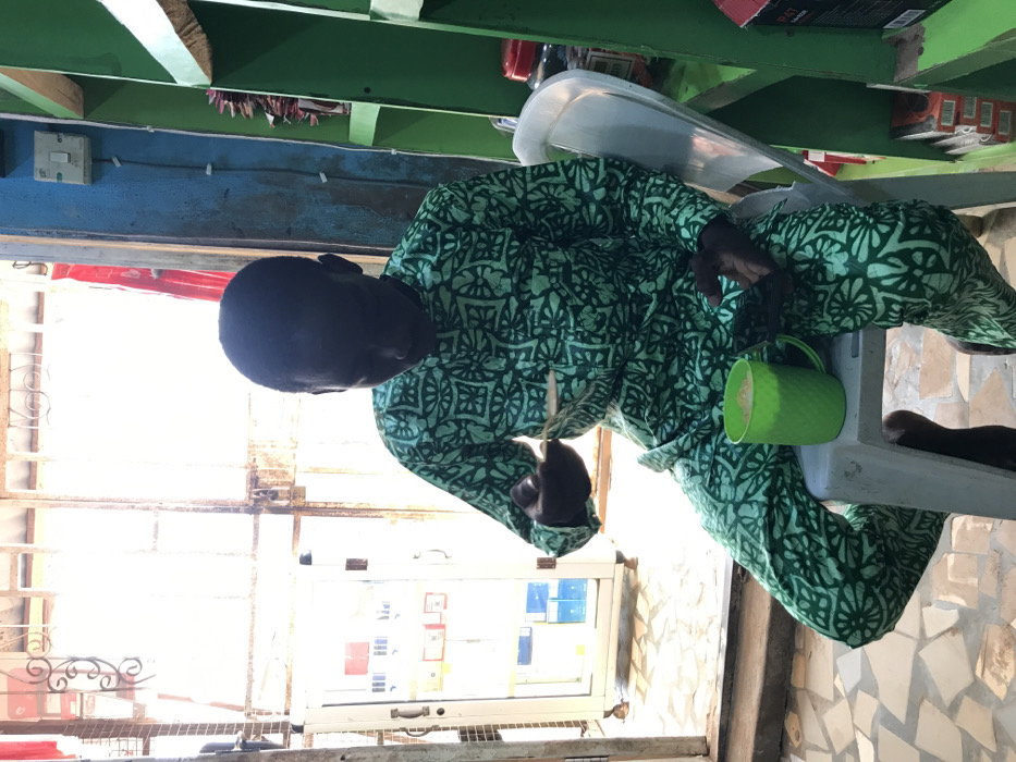This image captures an individual seated within an interior space, likely a shop or dwelling, in Ijoko, Nigeria