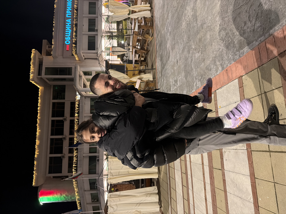 An adult male carries a child piggyback on a tiled sidewalk at night in Primorsko, Bulgaria