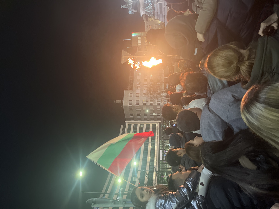 The image captures a dense outdoor nighttime gathering at Tsar Osvoboditel Square in Sofia, Bulgaria