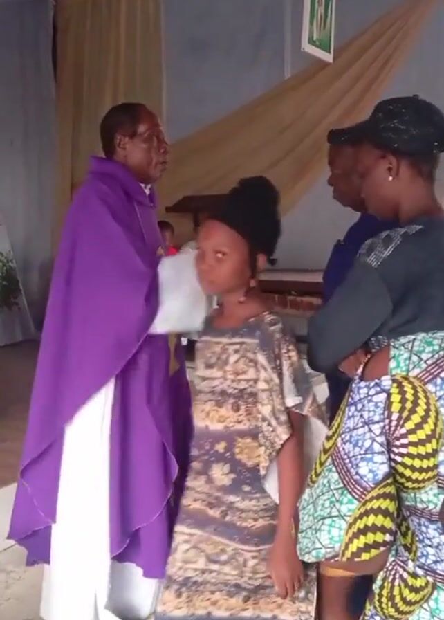 Inside a building with a corrugated metal roof, a priest wearing a purple robe stands with a small group of people. The priest is putting his hand on the forehead of a young woman wearing a black baseball cap, grey sweater, and tan skirt. There are two women standing next to her, one wearing a colorful patterned dress and the other in a similar outfit with a white headscarf. Another man wearing a blue shirt stands behind them. The room appears to be simple, with beige fabric draped in the background and a religious picture hanging on the wall. The priest is speaking.