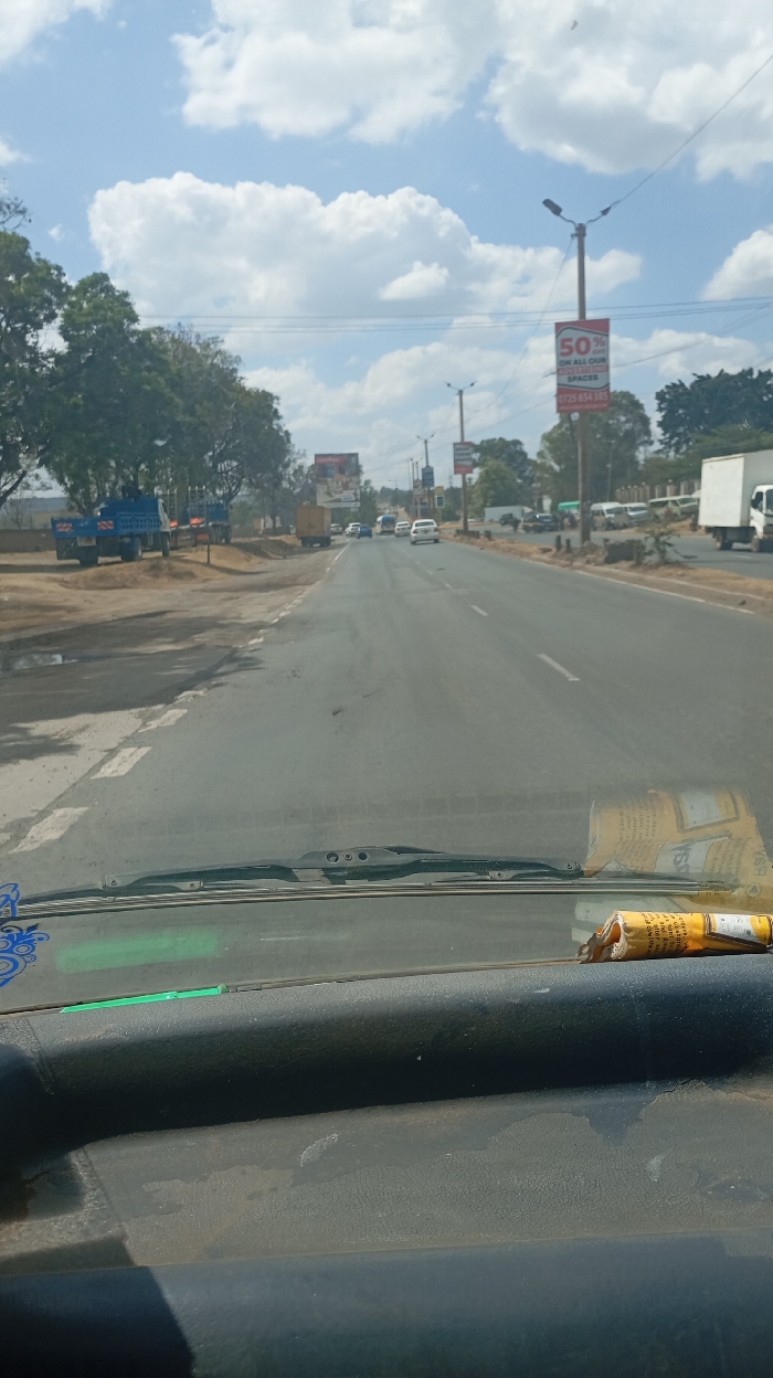 A view from inside a vehicle, focusing on the road ahead. The dashboard is visible in the foreground, with a package resting on it. The road is paved and stretches into the distance with some vehicles on it. Utility poles with signage are along the roadside. Green trees line the side of the road and partially obscure the sky with puffy white clouds.