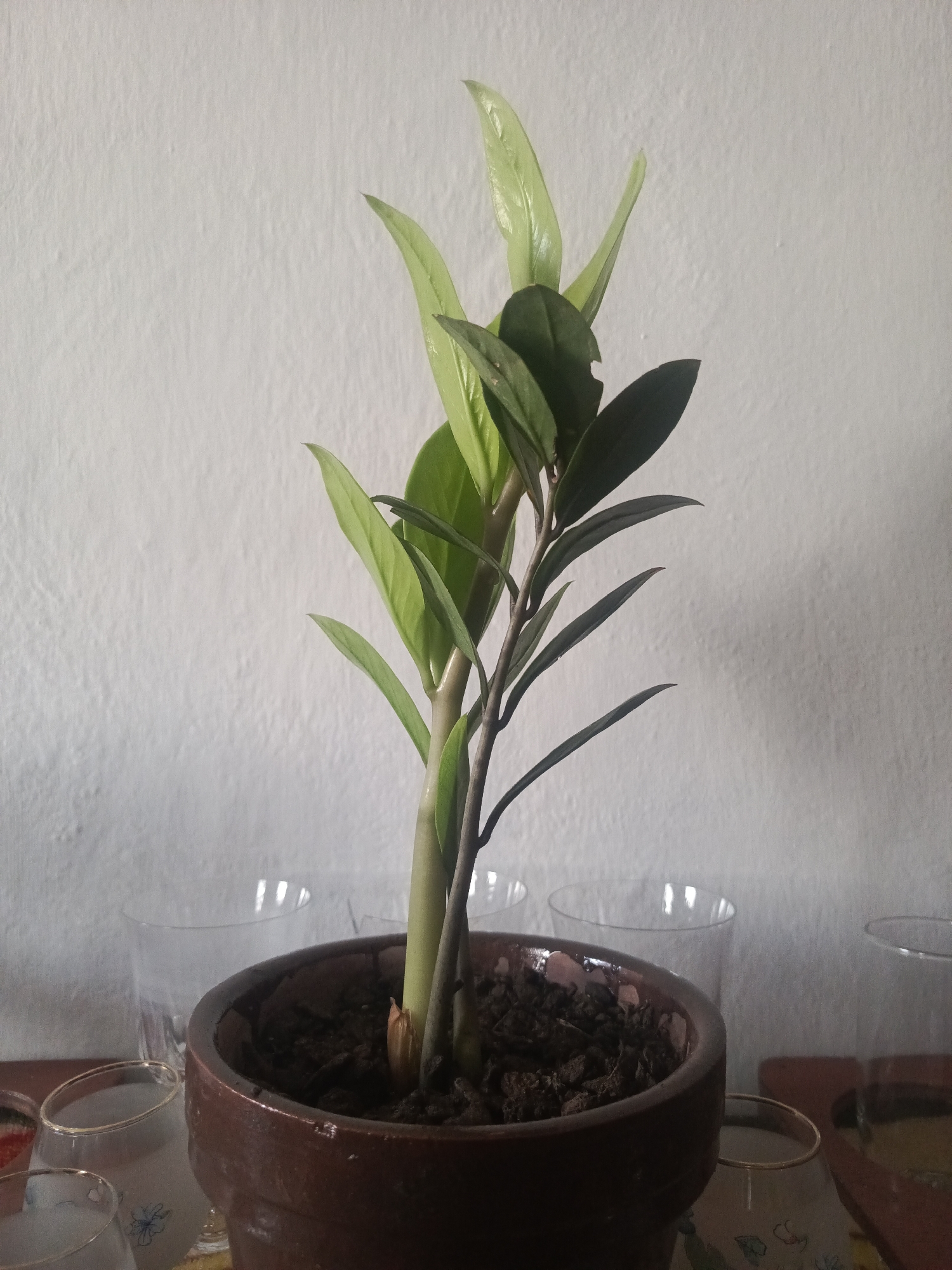 ZZ plant (Zamioculcas zamiifolia) in a brown terracotta pot. The plant has two main stems. One stem has newer, lighter green leaves, while the other has older, darker green leaves. The pot is filled with dark soil. The plant is sitting on a surface, possibly a table, surrounded by several drinking glasses. The background is a plain white wall. The scene appears to be indoors. The location given is Tinaco, Venezuela, but there are no elements in the image that directly confirm this location.
