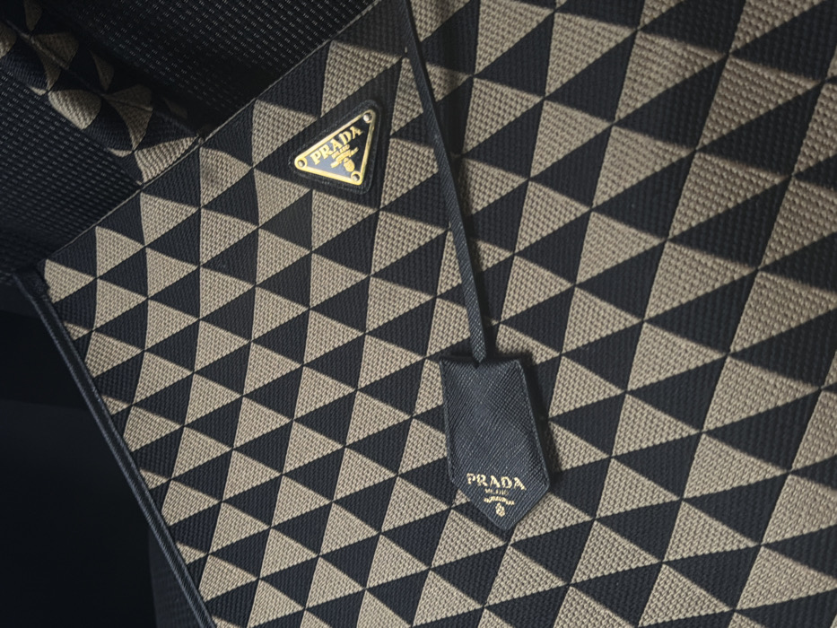 An overhead view captures a segment of a luxury textile item, likely a bag, in the City of London, United Kingdom. The item features a repeating geometric pattern of tessellated triangles, alternating between dark navy/black and beige/light brown. The dark triangles exhibit a raised, textured surface, while the beige triangles appear recessed. A gold-toned, triangular Prada logo plate is affixed to the fabric on the upper right side of the visible surface. Below this, a black textured leather tag, shaped as an elongated hexagon with "PRADA MILANO" in gold lettering, is attached via a narrow black strap to the patterned material. No individuals, actions, or specific environmental details beyond the object are discernible.