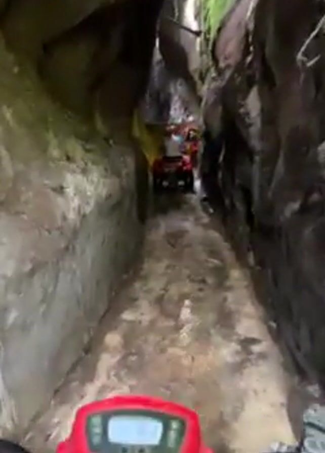first-person perspective of someone riding a red ATV through a narrow, rocky passage. Another ATV, also red, is visible ahead, carrying two people. The passageway is naturally formed with tall, uneven rock walls that converge overhead, creating a slot canyon effect. The stone surfaces are damp and show patches of moss. The floor of the passage is uneven and appears to have some water present. The light is dim within the passage, but brightens towards the exit.
