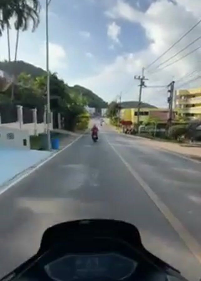 A first-person perspective video shows someone riding a motorcycle down a paved road on a sunny day. Two other motorcycles are ahead in the distance. The road is lined with tropical trees and various buildings on either side. The sky is blue with scattered clouds.