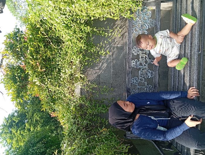 A daytime outdoor scene in Kecamatan Pati, Indonesia, depicts an adult female and a young child seated on a decorative stone or metal bench