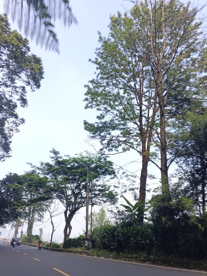 A street scene shows a black asphalt road with yellow dividing lines. A car and motorcycle travel on the left side. Trees line the road, some tall with sparse branches reaching for the light-blue sky. Green foliage covers the ground, with bushes and plants creating a natural barrier beside the road. A utility pole stands amidst the trees.