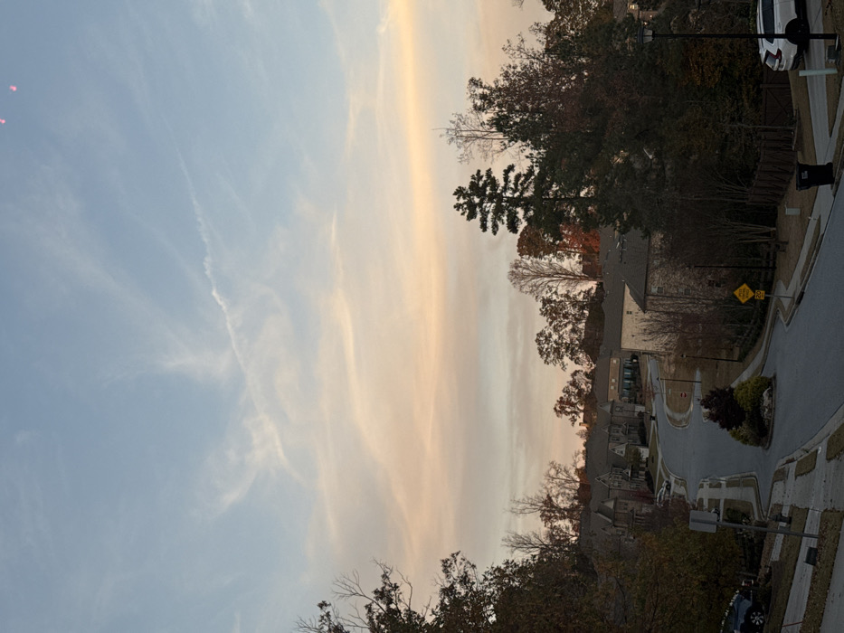 An elevated view captures a suburban neighborhood at dusk. The sky is a blend of blue and orange hues. Houses and trees line a curved street, with sidewalks and parked cars visible. A yellow street sign is seen. The trees have autumn colors. The photo is taken at an angle, oriented vertically.