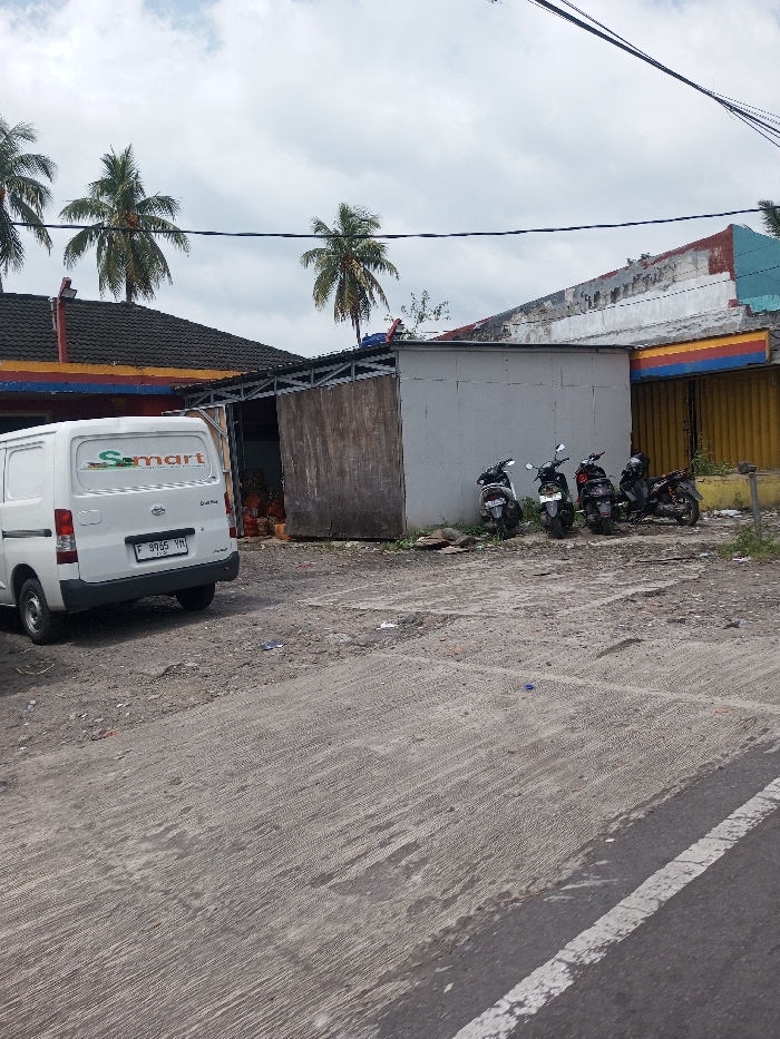 The scene is situated in the city of Khajuripada, India. It depicts an outdoor commercial or semi-commercial area under an overcast sky. In the immediate foreground, a textured concrete and dirt surface transitions into a segment of asphalt road marked with a faded white edge line. A white commercial van, displaying "S.mart" on its side and the license plate "F 8985 YH" at the rear, is parked on the left side of the frame. To the right of the van, four dark-colored motorcycles are parked in a row, facing right, adjacent to a plain, rectangular gray building. Behind the van, a building with a dark tiled roof and a colorful fascia featuring red, yellow, and blue stripes is partially visible. Further right, behind the motorcycles, another building with corrugated yellow metal walls and a weathered, similar colorful fascia is present. Overhead, multiple power lines span the frame, and several tall palm trees are visible rising above the structures. No individuals or specific activities are depicted in the image.