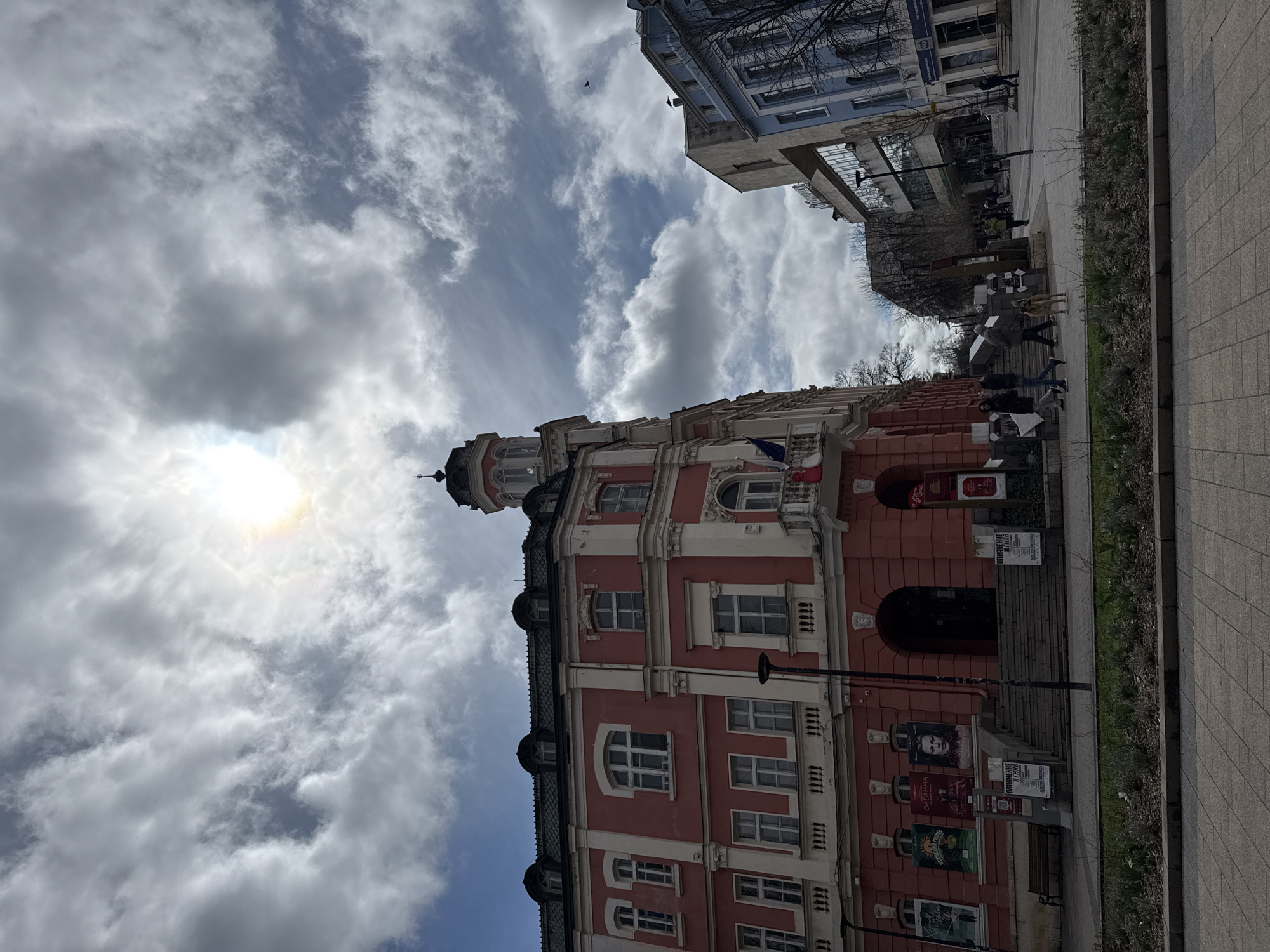 The scene depicts a pedestrian area in Pleven, Bulgaria, primarily featuring the Ivan Radoev Drama and Puppet Theatre on the left. This multi-story building is characterized by its reddish-pink facade with white architectural trim, a dark gray mansard roof, and a prominent corner tower with an ornate finial. A white balustraded balcony on the second floor displays a Bulgarian flag and possibly a European Union flag. The ground floor presents multiple arched entrances and windows, with posters advertising various theatrical performances affixed to its surface and flanking a central stone staircase leading to the main entrance. To the right of the theatre, a modern commercial building with large glass panels and a light-colored facade is visible, adjacent to a light blue building with multiple windows and ground-floor businesses, including one labeled "CCC." Bare trees are interspersed in this area. The ground is covered with gray rectangular paving stones, forming a broad pedestrian thoroughfare. A low planter bed with sparse, low-growing vegetation separates the immediate foreground from the main walkway. A black lamppost stands near the theatre's facade. Approximately 10-15 individuals are observed walking in various directions across the paved area, engaged in casual movement. A medium-sized, light brown dog stands on the pedestrian path in the mid-ground, facing left. The sky is partly cloudy, with a bright sunburst visible through a break in the clouds in the upper right quadrant.