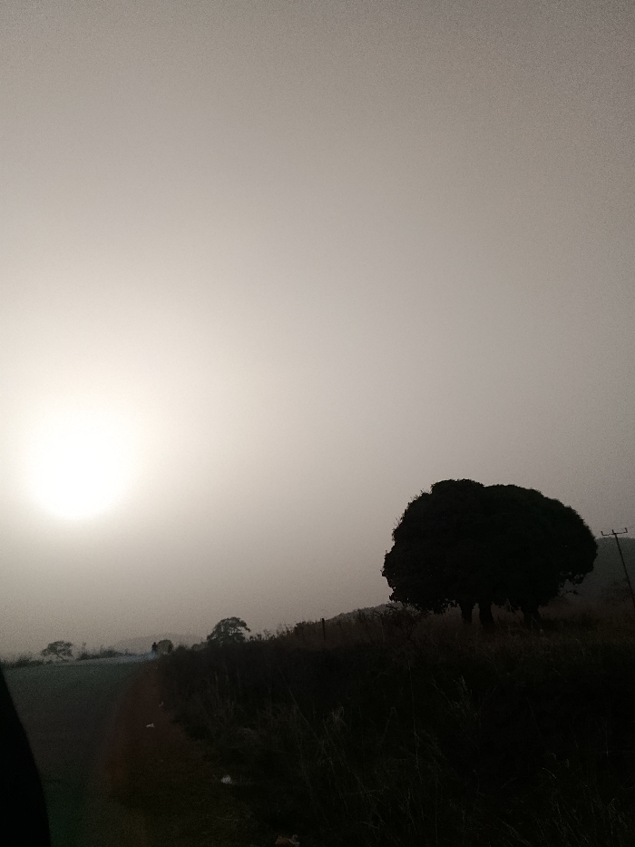 This image depicts an outdoor landscape in Mangu Halle, Nigeria, at either dawn or dusk, characterized by a pervasive haze. A bright, diffused light source, consistent with the sun, is prominent in the lower-left sky quadrant, casting the foreground and midground into silhouette. The upper two-thirds of the frame consists of a hazy sky transitioning from bright white near the light source to a light gray. A large, dark, rounded tree with dense foliage stands prominently in the mid-right. Smaller, less distinct trees are visible in the distant background on the left. A dark, unpaved road or path runs along the lower-left foreground, receding into the hazy distance. The ground is covered with dark, dry vegetation or tall grass. A utility pole with cross-arms is partially discernible on the far right, behind the prominent tree. No human figures or specific activities are present.