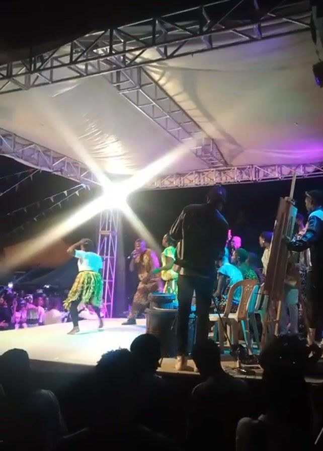 A live performance takes place on an outdoor stage at night. Performers include a dancer in a green and yellow skirt, a drummer, and a singer. Other people are on stage, some sitting in chairs. A large crowd watches the performance. The stage is covered with a white tarp supported by a metal structure. Bright lights shine on the performers. People in the crowd are silhouetted.