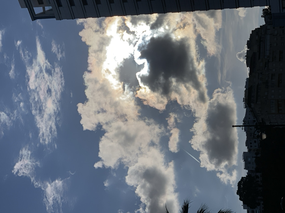 The image presents an urban landscape view under a partly cloudy sky in Tangier, Morocco, captured during daylight. The upper two-thirds of the frame feature a blue sky interspersed with various cloud formations, ranging from wispy white to dense, dark grey cumulus clouds. The sun is partially obscured by a large, dark cloud mass in the upper right, generating a bright, localized glare and illuminating the surrounding cloud edges with iridescent colors. A prominent, linear white contrail from an aircraft traverses the upper-left quadrant of the sky. In the lower third, the silhouette of urban infrastructure dominates. A modern, multi-story building with a light-colored facade and visible dark window openings occupies the far-right edge of the frame. Below the horizon line formed by the clouds, a collection of darker, older-style buildings are silhouetted against a distant hillside, suggesting elevated terrain. A single, dark streetlight pole with a visible lamp fixture stands in the lower-middle left. On the far left, the silhouette of palm tree fronds is partially visible. No individuals are present, and no active interactions are depicted within the scene, beyond the aircraft's atmospheric effect.