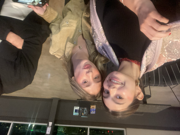 Two young women pose indoors. One wears a tan jacket with a delicate necklace, the other a black top with a patterned jacket. They stand close together, smiling. The background shows a nighttime cityscape through a window, and a table with small objects. The photo is tilted, giving a unique perspective.