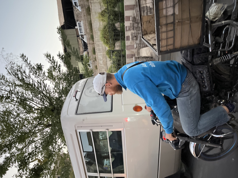 This image captures an urban street scene in Rukn ad-Din Municipality, Syria, likely during daylight with diffused lighting. The primary subject is a light-skinned male riding a black motorcycle from right to left, viewed from his right side. He wears a grey baseball cap with sunglasses perched on top, a light blue long-sleeved shirt with partially visible white text ("Ask abou...") on the back, blue jeans, dark socks, and dark shoes. He has a short, reddish-brown beard. His hands are on the motorcycle handlebars, and his posture suggests active riding. The motorcycle features a black quilted seat with studs and a rear metal rack carrying a large, open-top crate, appearing to be made of wood or cardboard within a metal frame. Immediately to the left of the motorcyclist is a white minibus, also moving in the same direction, with its rear section and side windows visible. The minibus has horizontal bars on its side windows and orange taillights. The background shows a street environment. To the right of the vehicles, there is a raised concrete or stone retaining wall topped with green bushes. Beyond this wall, on an elevated level, various buildings or structures are visible, some with what appear to be corrugated metal roofs or makeshift constructions. Several white vehicles, possibly vans or minibuses, are parked on this elevated area. To the far right, near the motorcyclist's rear wheel, a partially constructed stone or brick archway or decorative element is visible on the elevated ground. The upper left portion of the image features a large tree with green foliage, silhouetted against a light blue sky.