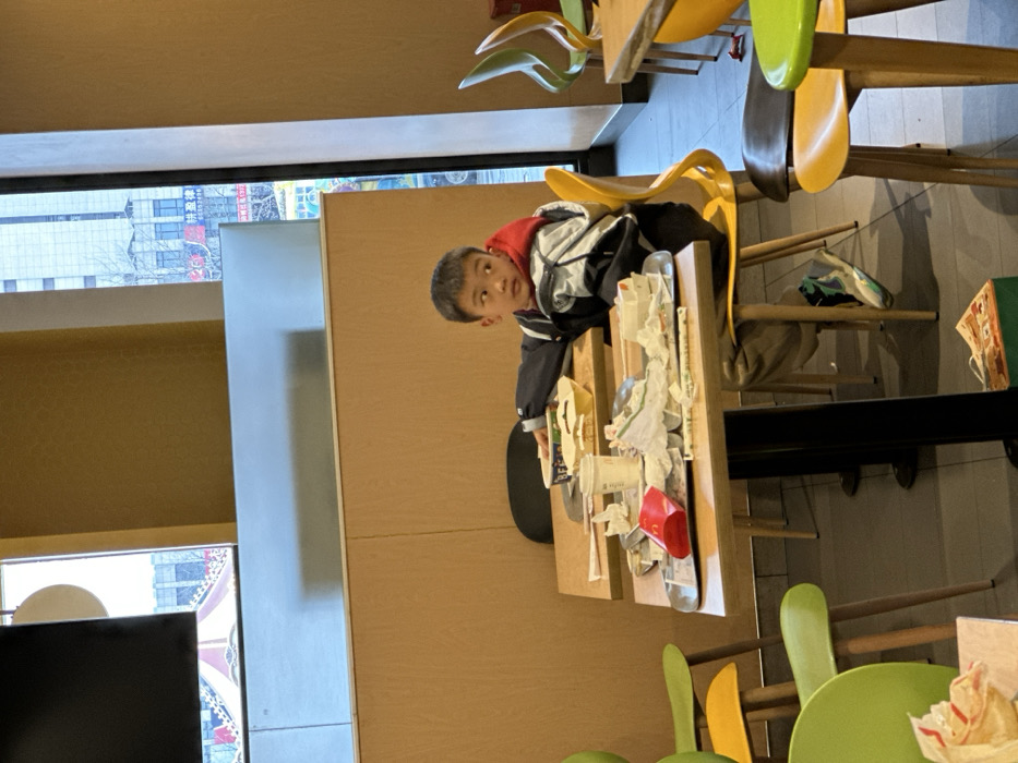 The image captures an indoor scene within a fast-food restaurant in Xihu District, China. A single East Asian male child, estimated to be between 6 and 10 years old, is seated on a yellow, modern-style chair at a rectangular wooden table in the foreground-midground. He wears a dark, possibly navy, hooded jacket over a red hoodie and light-colored trousers, with athletic shoes visible on his left foot. His left arm is extended and resting on the tabletop, while his head is turned to his right (viewer's left), exhibiting a neutral, outward gaze. The table in front of the child holds a black rectangular serving tray cluttered with post-meal refuse, including crumpled white paper napkins, assorted wrappers, a white paper cup with a McDonald's logo, and a red plastic cup. A yellow bowl, possibly containing food remnants, is also present on the table near the child's left arm. The interior environment features light brown wooden wall paneling and a dark-colored floor. Several other chairs in yellow, green, and dark tones are visible around adjacent tables, suggesting an active dining area. A large window spanning the upper right portion of the frame offers a view of an urban exterior. Visible through the window are multi-story buildings, street-level signage with Chinese characters (including "拱宸桥" on a red sign), and bare tree branches, indicating an outdoor, possibly cold, daytime setting. A green and white patterned bag or box is on the floor beneath a table in the lower right corner, and a small red object, possibly a toy, is on the floor further back.