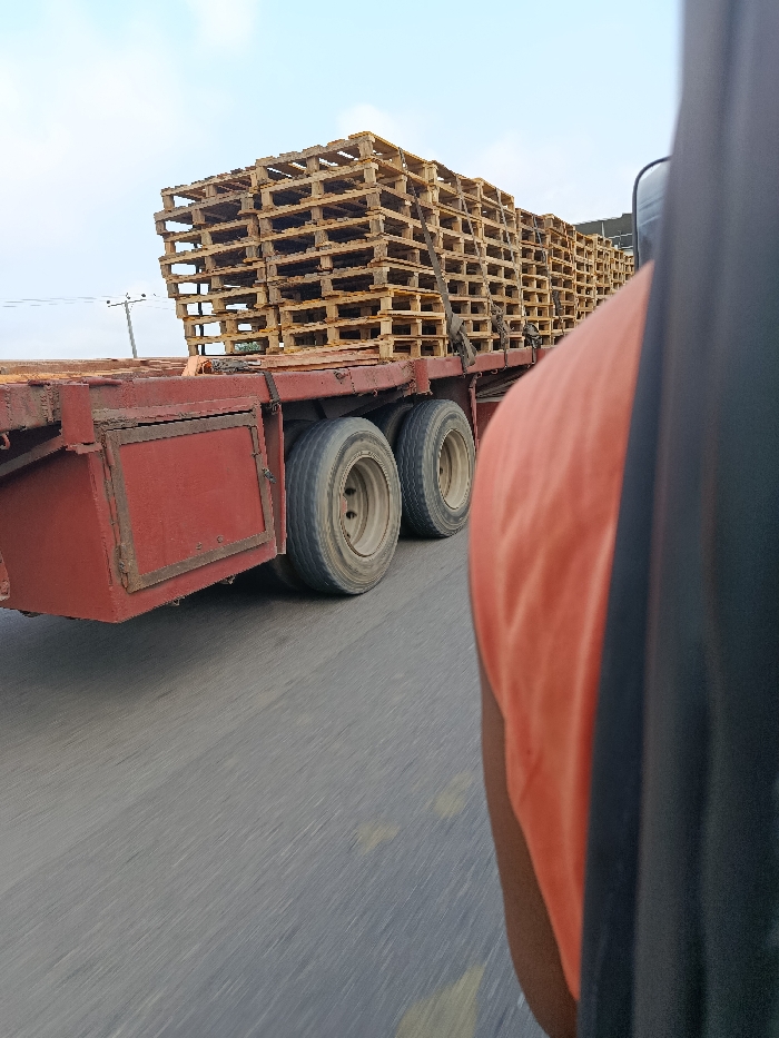 The image depicts a red flatbed trailer truck in motion on an asphalt road in Igbogidi, Nigeria. The trailer is heavily loaded with numerous stacks of light brown wooden pallets, secured by dark straps. Two axles, each with dual tires, are visible on the left side of the trailer. The road surface shows motion blur and faint yellow markings. A utility pole with wires is visible in the background on the left. The sky is light blue with some cloud cover. In the immediate foreground on the right, a partial view of a person's left shoulder and arm, clad in an orange shirt, is visible, alongside a dark vertical component of the vehicle from which the photograph was taken.