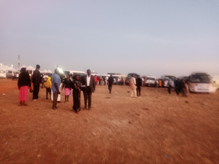 An outdoor gathering appears to be underway, with several people standing in a large, dirt-covered field. A line of white vans and buses are parked in the background. The sky is overcast. Most people in the foreground wear dark clothing, some with bright accents. The scene is somewhat blurred. A tall, thin structure can be seen in the distance.