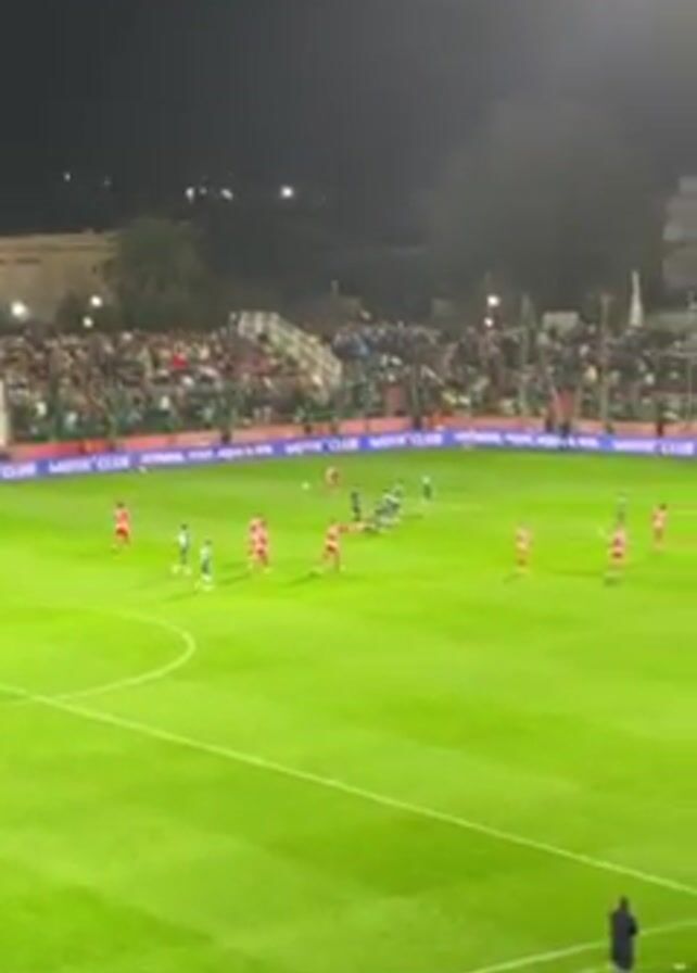 soccer game at night. The crowd is in the stands, and there are players in green and red uniforms on the field. A player is on the ground while other players surround him. The video is shot from the stands.