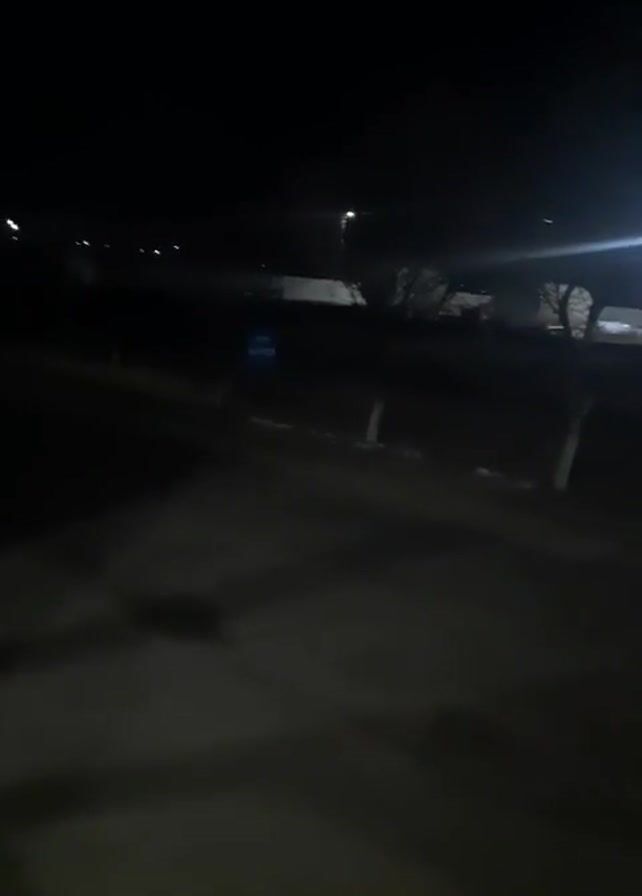 dark scene at night. There is a paved area with some small puddles. In the distance, there are a few buildings and streetlights, which are the main source of illumination. The lights create a strong glare. There are also small posts running along the edge of the pavement. There are no people visible in the scene. The video is still and there is no sound.