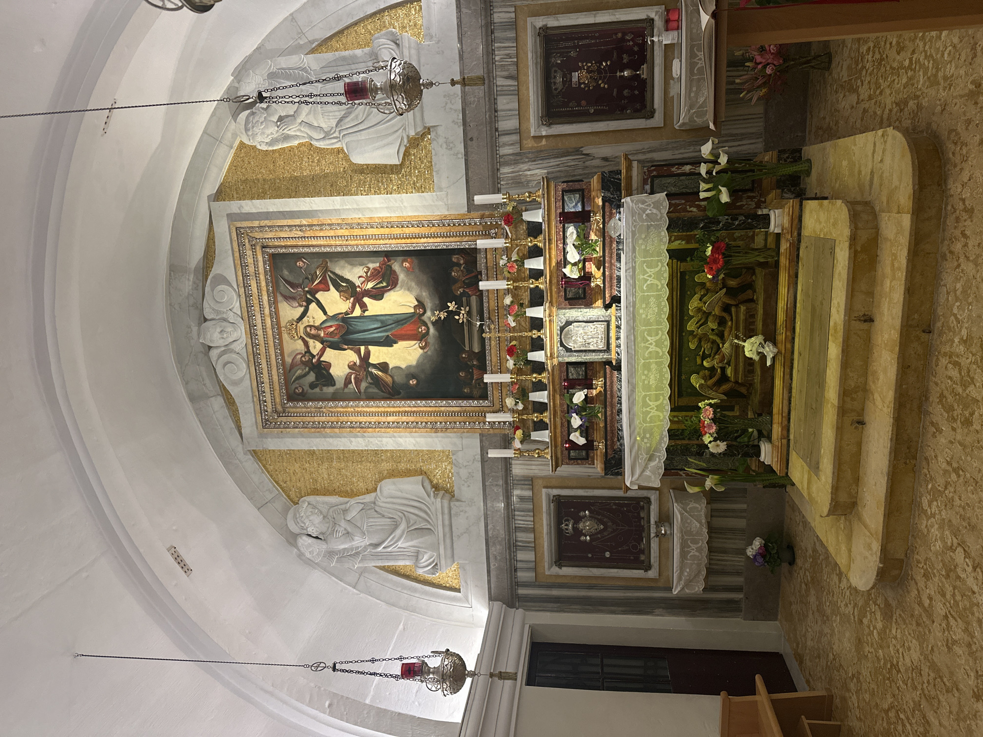 This image presents a forensic view of a meticulously adorned religious chapel interior, located in Għarb, Malta. The central focus is an altar area against a wall dominated by a large, ornate golden-framed painting depicting the Virgin Mary in a blue and red robe ascending amidst numerous angels and cherubs, with figures looking upwards from below. This painting is set within an arched recess, backed by golden mosaic tiles and flanked by two large white marble sculptures of kneeling winged angels; the left angel has crossed arms, while the right's hands are clasped in prayer. Below the painting, the multi-tiered altar features multiple gold-colored candlesticks holding white candles, interspersed with vases of red and white fresh flowers. A small silver crucifix and a small framed religious artifact are also on the upper tier. The mid-tier includes a carved or sculpted relief, likely depicting figures, flanked by vases holding white calla lilies and red flowers. The front of the altar is draped with a white lace cloth over a green fabric, displaying a repeating "MC" motif. The vaulted ceiling is white, with a visible white rectangular panel, possibly a speaker or ventilation grill, on the left side. Two ornate silver-toned metal hanging lamps with red glass inserts are suspended by chains from the ceiling, flanking the central altar. The floor is covered in light brown tiles with an irregular, mottled pattern. To the left of the altar, a dark wooden door with horizontal panels is partially visible, next to a simple wooden bench. Above this area, a framed reliquary with a red velvet background displays a crown-like object. Below it, a small wall-mounted shelf is covered with a white lace cloth, and a potted plant with purple and white flowers sits on the floor. To the right of the altar, a similar framed reliquary, also with a red velvet background, displays an intricate golden object. Adjacent to this, a wooden lectern holds an open book and a vase of pink flowers. A small pump bottle and a red container are also present on a nearby ledge.