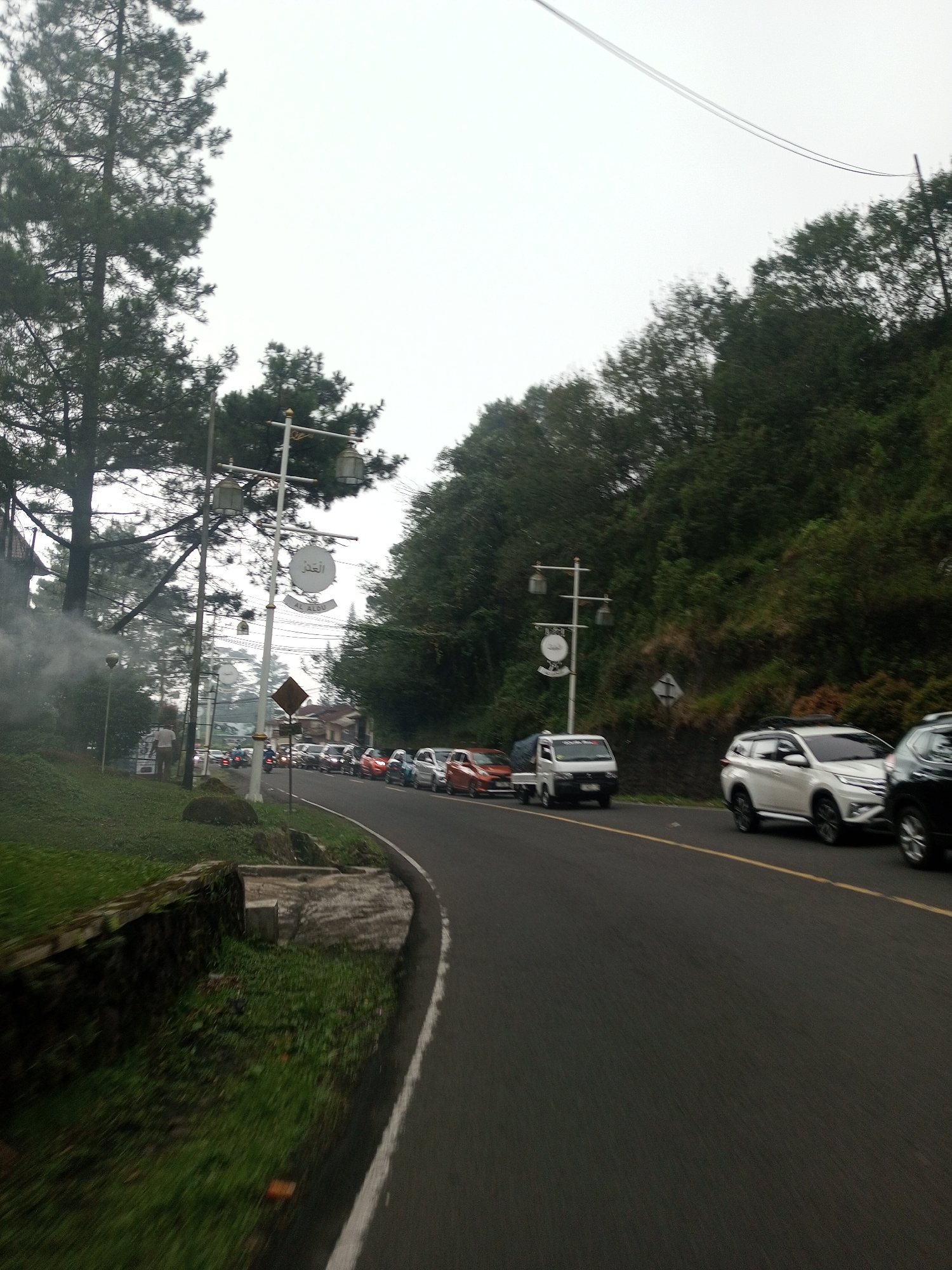 road with a line of vehicles on a cloudy day in what appears to be a mountainous area. The road curves gently to the left, and the left side of the road is bordered by a grassy verge, a low stone wall, and tall trees. The right side of the road is bordered by a steep, tree-covered hillside. There are streetlights and signs alongside the road. A white sign with a circular emblem and Arabic script is affixed to the streetlights. Traffic is heavy, with a mix of cars and a small truck visible. The image does not provide enough information to determine the specific location within Mae Chan District, Thailand.