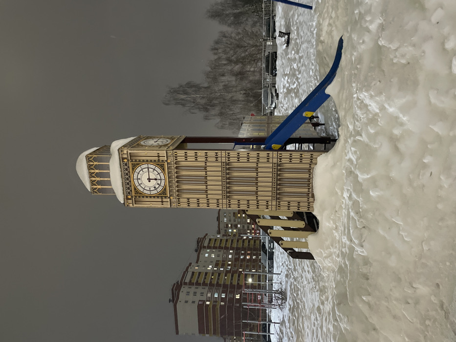 A whimsical playground structure shaped like the Big Ben clock tower stands on a snowy ground