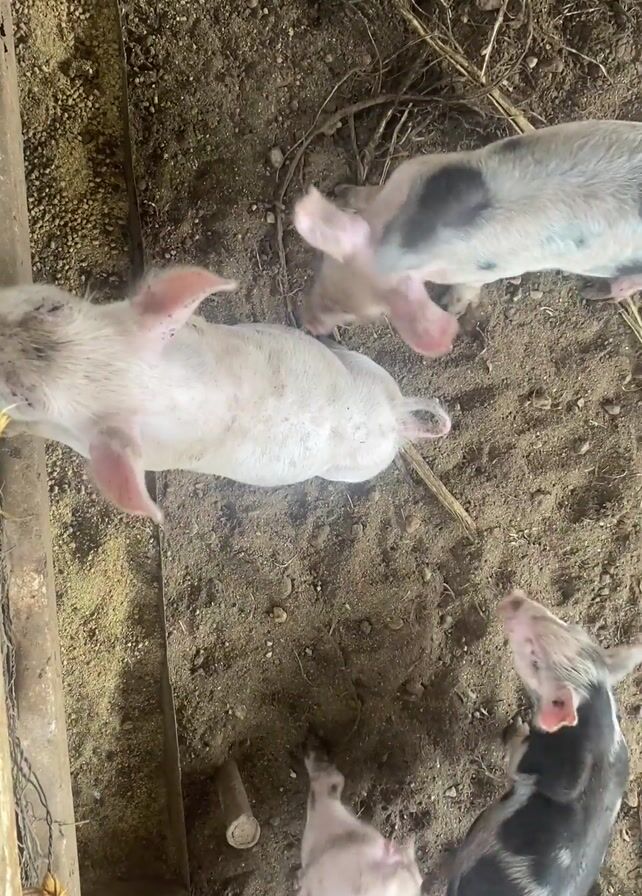 four piglets lying in a muddy pen. The piglets are all pink and white, with varying amounts of black spots. They are lying on the ground, some touching each other, in an enclosed space. There is a metal fence visible, and some stray pieces of hay or straw in the enclosure. The overall shot is taken from above, looking down into the pen. Some piglet squeals are audible.