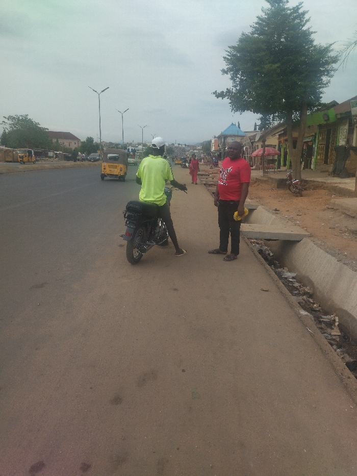 street scene in Junction, Nigeria, at coordinates latitude: 8.958, longitude: 7.551. Two men are standing on the side of the road, one wearing a lime green shirt and a white helmet, and the other wearing a red shirt. The man in the lime green shirt is standing next to a motorcycle and appears to be preparing to ride it. There is a concrete drainage ditch on the edge of the road. There are buildings on the opposite side of the road. The sky is cloudy and there are trees lining the road. In the background, three yellow vehicles, possibly tricycles, are parked and a few more cars are driving on the paved road. The scene appears to be on a relatively quiet residential street in Junction.