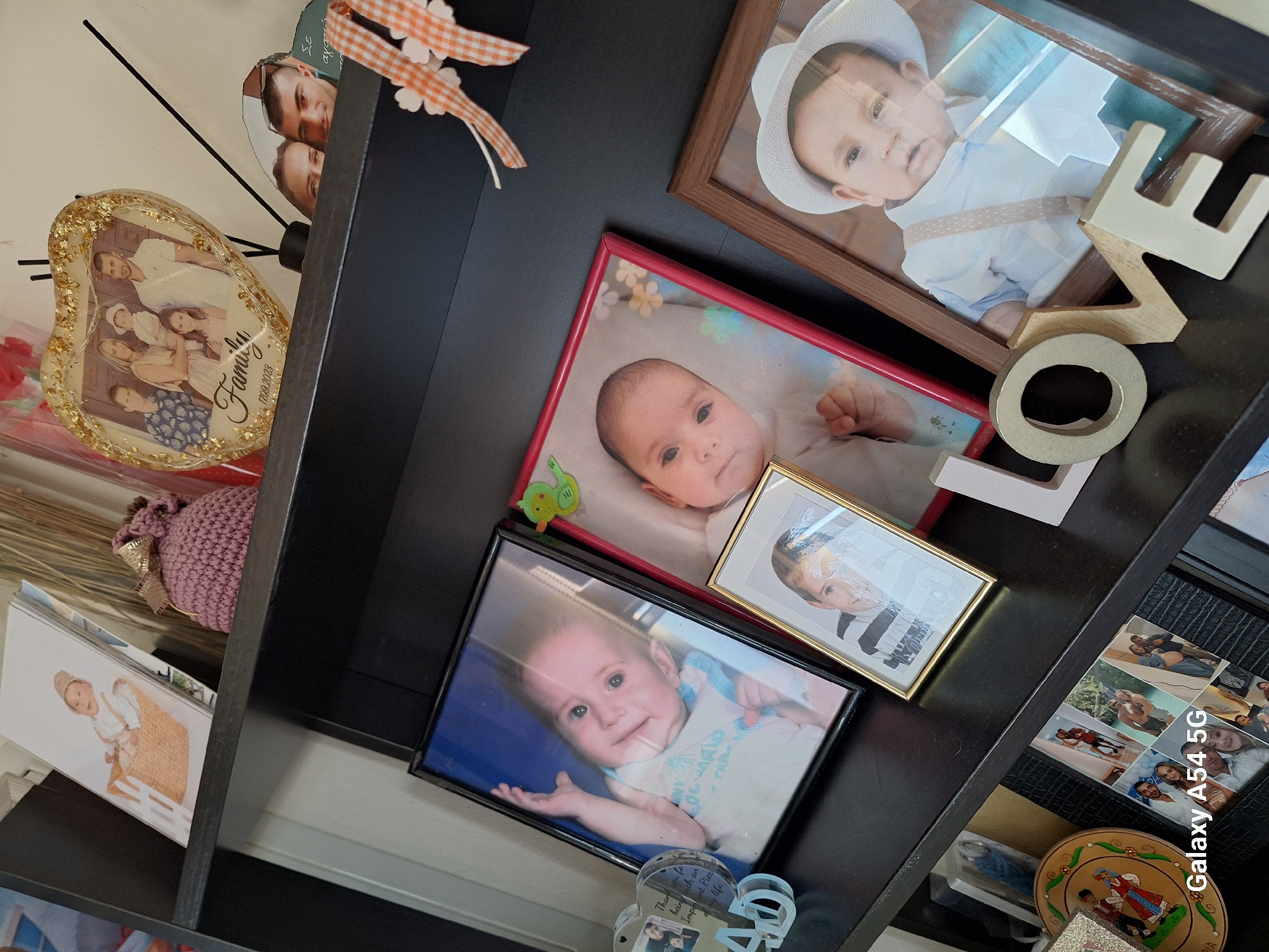 The image displays a detailed view of three shelves within a dark-colored shelving unit, likely located in a residence in Xylofagou, Cyprus. The shelves are filled with personal mementos and framed photographs, predominantly featuring infants and children. On the top shelf, from left to right, a stack of paper items includes a photograph of an infant in a wicker basket. Adjacent is a small, purple, crocheted pouch with a gold ribbon. Next, a heart-shaped, clear resin photo frame with embedded gold flecks showcases a family portrait of five individuals (two adult males, one adult female, one child, one infant), inscribed with "Family" and the date "17.09.2023". To its right, a dark diffuser stick protrudes from a black base. Partially visible on the far right is an irregular-shaped decorative item featuring two faces and Greek text. Two checkered orange and white ribbon decorations with small white clover-like shapes hang above the shelf. The middle shelf presents a collection of framed photographs. A clear, heart-shaped "DAD" ornament is partially visible on the far left. A black-framed photograph captures a smiling infant in a blue-accented top with a hand raised against a blue background. Next to it, a smaller gold-framed photo shows a young child in a striped shirt. A red-framed photo displays an infant lying on a floral background. On the right, a brown-framed photo features an infant in a white shirt, suspenders, and a white fedora-style hat. In the foreground of this shelf, four wooden letters spell "LOVE", with varying light and gold tones. The bottom shelf is partially visible, showing a round, painted wooden plate depicting figures in traditional attire, with "CYPRUS" text visible. Next to it is a black-patterned photo album or large frame displaying multiple smaller photographs of adults and children in various settings. A "Galaxy A54 5G" watermark is present in the lower-left corner of the image.