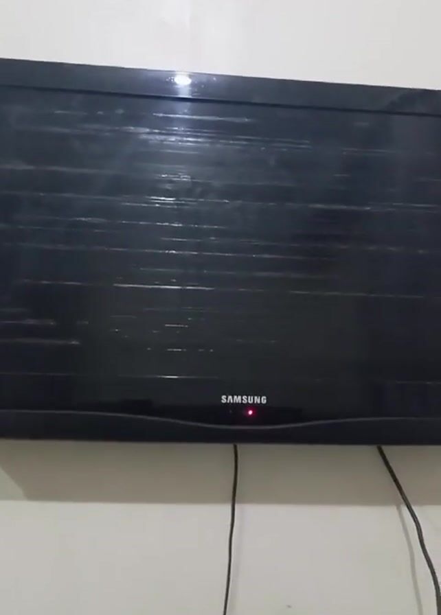 black Samsung TV mounted on a white wall. The TV is off, indicated by the red light at the bottom center of the TV frame. There are multiple horizontal lines visible across the TV screen, possibly scratches or damage. Two black cables are dangling beneath the TV. The wall appears to be a plain, light-colored surface.