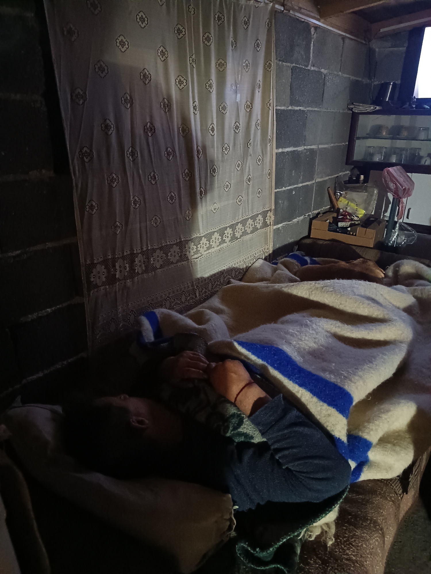 A person lies asleep in a dimly lit room. The individual is covered with a white blanket that has a blue stripe, and they are wearing dark-colored clothing. The person's head rests on a brown pillow. The room is constructed of cinder blocks, and a patterned curtain hangs on one wall. A television is visible in the background. Miscellaneous items are on a shelf near the TV. The location is an unidentified room in an unknown city.