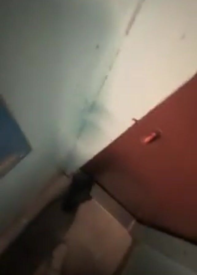 someone opening a narrow metal door with a small rectangular window near the top. The door is painted a reddish-brown color, and the surrounding frame and walls are a light blue or green. The door is opened from inside. The view through the window in the door shows a set of steps or stairs. There appears to be some minor writing or markings on the door itself. The location seems to be indoors, potentially within a building with old or industrial-style fixtures and finishes.
