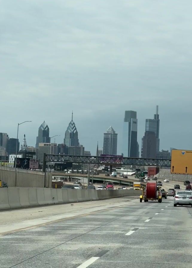 From a moving vehicle on a highway, a view of the Philadelphia skyline emerges under a cloudy sky