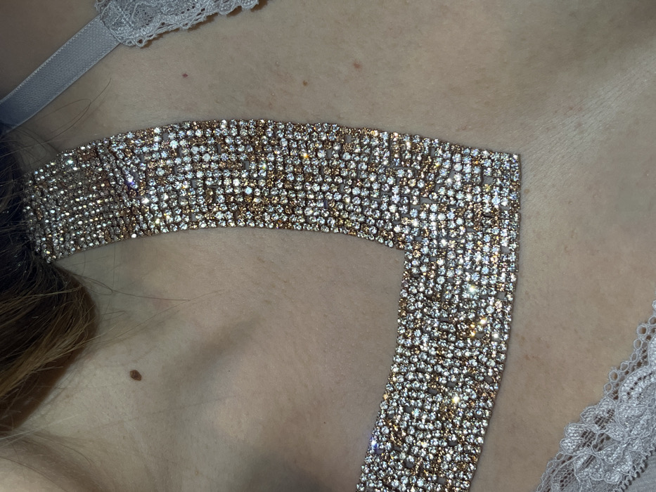 A close-up photograph depicts the upper chest, clavicle, and lower neck area of an individual. The subject's skin is fair. Prominently featured is a wide, V-shaped decorative element, appearing as a choker-style necklace or an integrated garment detail, entirely covered with numerous small, glittering rhinestones. These rhinestones are arranged in dense rows and exhibit two distinct color tones: clear/silver and amber/gold, intermingled across the surface. A light grey or silver-colored garment, possibly a bra or top, with a lace trim, is partially visible on the lower left and upper right edges of the frame. A thin, grey strap from this garment is seen in the upper right. On the skin above the subject's left clavicle, a singular, dark brown, raised nevus (mole) is present. Minimal light brown hair is visible at the very top of the frame. The immediate environment beyond the subject's body and attire is not discernible. The specific city location of Varna, Bulgaria, cannot be determined from the content of this image.