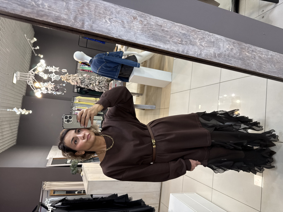 An interior shot depicts a woman taking a mirror selfie within what appears to be a clothing boutique. **People/Subject:** A woman in her 30s-40s with short, wavy brown hair, featuring lighter highlights, is centered in the frame. She holds a light-colored smartphone with multiple rear cameras in her right hand, pointing it towards her reflection in a large mirror. Her expression is neutral, with lips slightly parted. **Objects/Attire:** The woman is dressed in a dark brown, long-sleeved, oversized tunic-style garment. A thin brown belt with a golden, rectangular buckle is cinched around her waist. A golden chain necklace adorns her neck. Below the tunic, a black, sheer, ruffled skirt or dress extender is visible, reaching towards her ankles. The mirror she is using features a rustic, light greyish-brown wooden frame along its right edge. **Environment:** The background, visible primarily through the mirror's reflection, indicates a retail space. Walls are painted a dark grey. The floor is composed of large white tiles with dark grout lines. Overhead lighting consists of track-mounted spotlights with white fixtures and a decorative white chandelier featuring star-shaped elements. In the reflection, a white headless mannequin torso wearing a cropped blue denim jacket and a dark bottom is displayed on a white rectangular pedestal. Behind the mannequin, a large, textured decorative piece resembling an abstract tree sculpture or a holiday display is visible. To the left, a rack holds various black garments, and a white, planked display unit is present. Further in the background, a clothing rack displays garments in multiple colors, including light blue, yellow, and green. **Location:** The specific location within the city of Krasnoyarsk, Russia, cannot be determined from the visual evidence provided in the image.