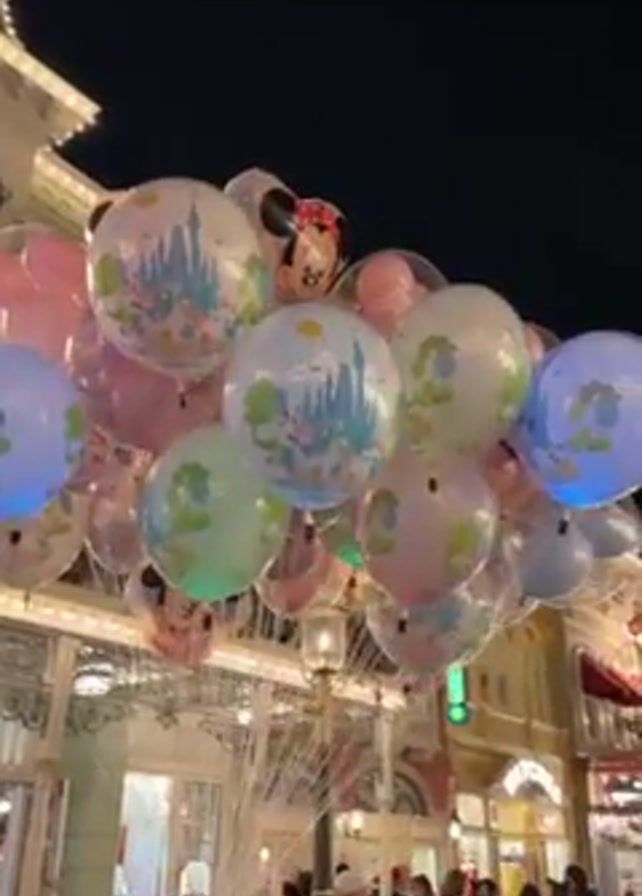 cluster of brightly colored balloons in front of a brightly lit building at night. The balloons feature different colors of pink, blue, and green, and some of them have a white castle graphic printed on them. There are also a few Mickey Mouse and Minnie Mouse shaped balloons. The balloons are strung together with long, thin, white ribbons. People are milling about in the background. The building is festooned with elaborate white lights.