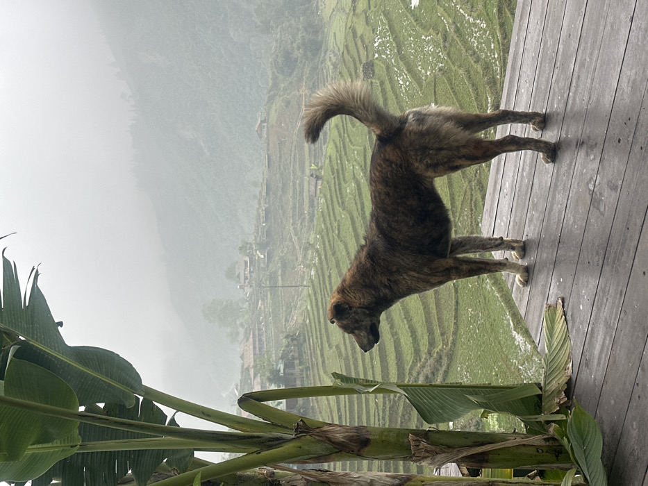 - "The image depicts a brindled dog standing on a wooden deck overlooking terraced rice fields and distant mountains in Tả Van, Vietnam, under overcast conditions" by FM-7mrtA2, licensed under CC BY 4.0
