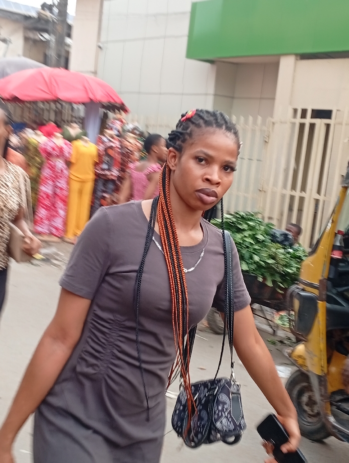 A woman stands in a bustling outdoor market. She wears a gray dress, a delicate silver necklace, and her hair is styled in braids with orange highlights. A patterned shoulder bag hangs on her left side. In her right hand, she holds a black smartphone. The background includes a red umbrella, clothing displays, a building with a green awning, a yellow tricycle, and people. The scene suggests a typical day in a busy urban commercial area.