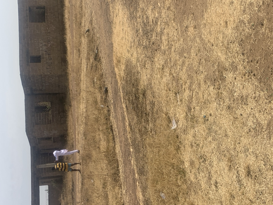 The image depicts an outdoor scene in Durimi, Nigeria, featuring two male individuals in front of a partially constructed or dilapidated single-story building under a hazy sky. The ground consists of dry, light brown soil with sparse patches of dead, yellow-brown grass and several dirt tracks. Scattered white plastic debris is visible on the ground. The building, constructed from rough-hewn stone or cinder blocks, has multiple rectangular openings serving as windows or doorways, lacking frames or glass. Markings or graffiti, including the partial word "GUAS," are present on its exterior walls. A concrete pillar stands near an opening on the left side of the structure, and barbed wire is visible on a wall further behind the building to the left. One male subject, positioned to the left, wears a yellow and black horizontally striped short-sleeved shirt and dark shorts. He is facing towards the building, slightly turned towards the second subject. The second male subject, to the right, wears a white long-sleeved tunic and trousers. He is facing the first subject, with his right arm extended and his hand appearing to touch or gesture towards the first subject's upper body.